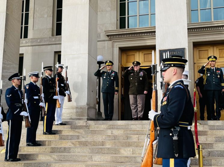 또 양국 합참의장은 역내 및 한반도 안보 환경 평가를 보고 받고, 북한의 핵 위협 및 미사일 발사 등 지속적인 도발과 그 외 역내 불안정을 야기시키는 행동 및 대응에 대해 논의했다. 밀리 의장은 지속적인 확장억제 제공을 포함한 한국에 대한 방위공약을 재확인했다고 합참이 전했다.
