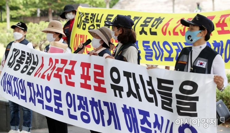 6·25전쟁국군포로유족회 관계자들이 13일 서울 용산구 전쟁기념관 앞에서 국군포로 유가족 지위 인정 촉구 집회를 하고 있다./김현민 기자 kimhyun81@