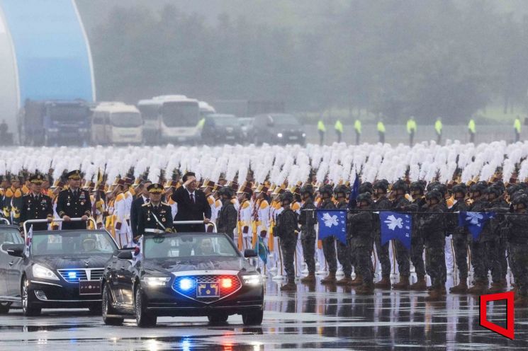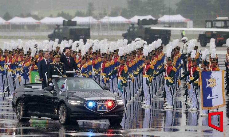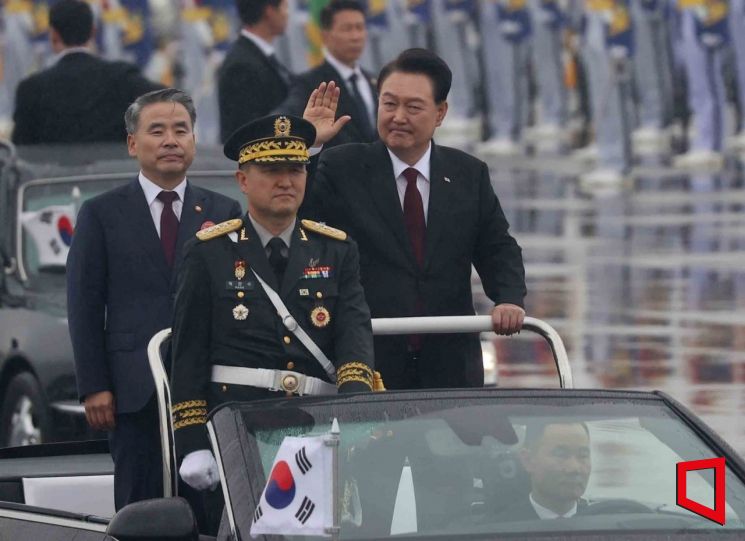 윤석열 대통령이 26일 경기도 성남 서울공항에서 열린 건군 제75주년 국군의 날 기념식에서 차량에 올라 부대를 사열하고 있다. 사진=사진공동취재단
