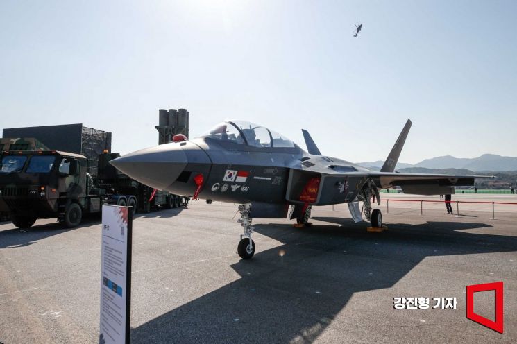 17일 경기 성남 서울공항에서 열린 '서울 국제 항공우주-방위산업 전시회(ADEX) 2023'에서 국산 초음속 전투기 KF-21이 공개되고 있다. 사진=강진형 기자aymsdream@