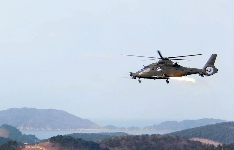 지난 10일 충남 태안 안흥시험센터에서 실시한 품질인증사격시험에서 소형무장헬기 공대지유도탄 '천검'이 발사되고 있다.